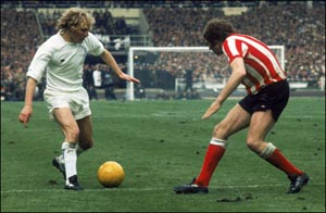 Oddly enough the 2 Managers found then on opposition sides again with Don Revie and Bob Stokoe having contested the 1955 Final when Newcastle United took on Manchester City. Sunderland had played Leeds United before in the FA Cup, 1926/27 and a 3 match marathon in 1967, all won by the Yorkshire side. In the run up to the final Sunderland had used 17 players. In the twenty days before Wembley Sunderland played eight League games, giving them a return, since Bob Stokoe took over, of 30 points from 22 games - promotion standard. The nation had taken Sunderland to their hearts. And the boys did not disappoint. They were without awe of Leeds; they chased them, they looked for goals. Bobby Kerr won the toss for Sunderland and elected to defend the end where the Leeds United fans had massed. As if to prove the lack of fear on the part of Sunderland Ritchie Pitt scythed down Allan Clarke early on. Reputations counted for nothing in this game. After half an hour Harvey in the Leeds goal, lifted a lob from Kerr over the bar. The corner from Hughes was sent back into the centre by Halom, and Porterfield bringing the ball down with his left thigh turned a little and hit it hard with his right into the net.